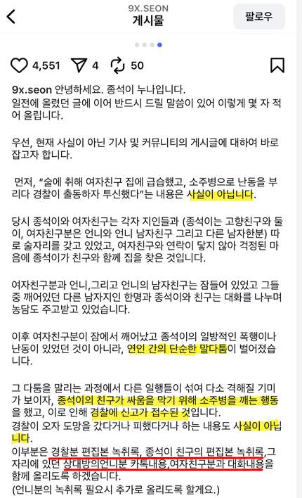 김종석 누나는 인스타그램을 통해 기사 및 커뮤니티에 잘못 퍼진 루머에 대해 재차 반박하며, 녹취록 일부와 당시 정황을 정리한 입장문을 공개했습니다.