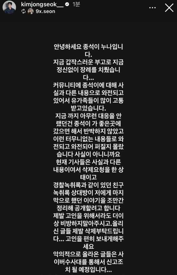 김종석의 친누나는 6일 인스타그램 스토리를 통해 유족의 입장을 직접 전했습니다. 주요 내용은 다음과 같습니다.