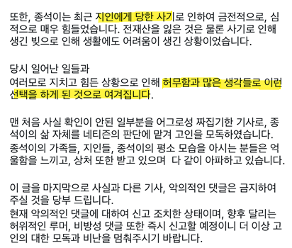 - 루머 바로잡기 요청 – “고인의 명예를 지켜달라”, “사실확인 전 추측 자제”