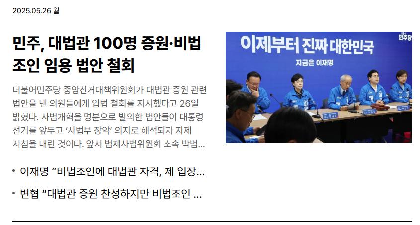 더불어민주당은 2025년 5월, 대법관 수를 최대 100명까지 늘리고, 비법조인도 임명할 수 있도록 하는 법안을 발의했습니다.