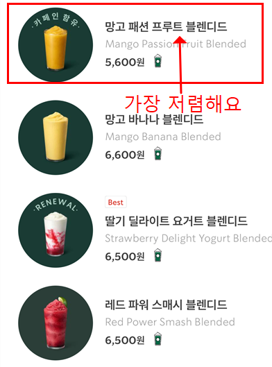 - 추천 메뉴: 망고 패션 프루트 블렌디드 (Tall)