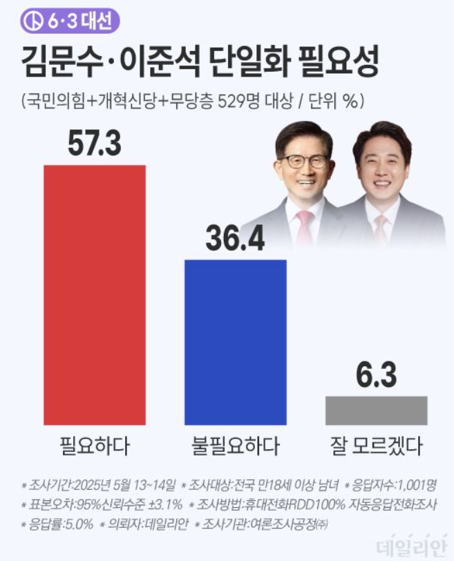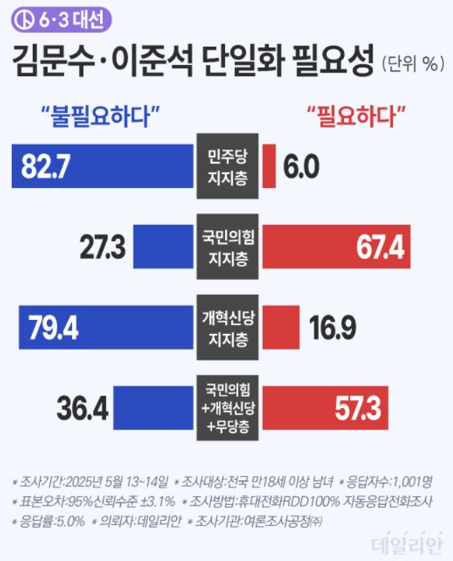 - 김문수의 보수 결집력 + 이준석의 젊은층·중도층 영향력이 결합되면 오차범위 내 역전 가능성도 존재