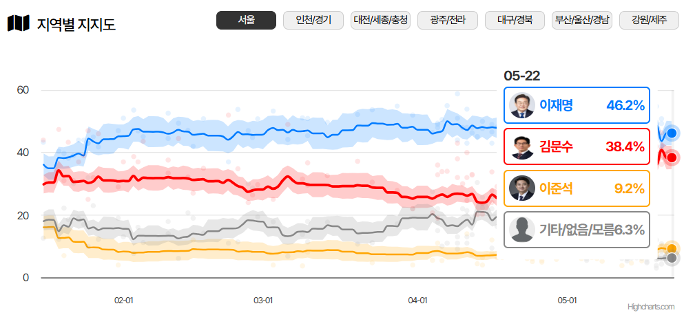 - 서울: 이재명 우세 (46:37 비율)