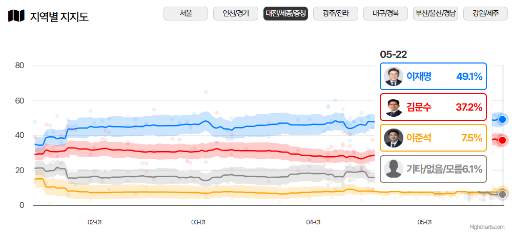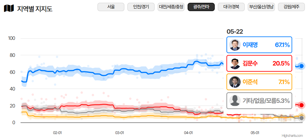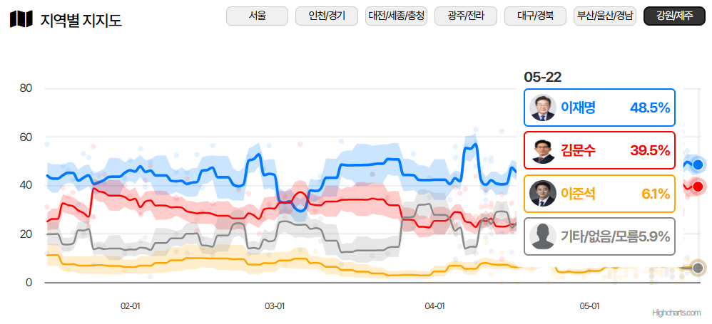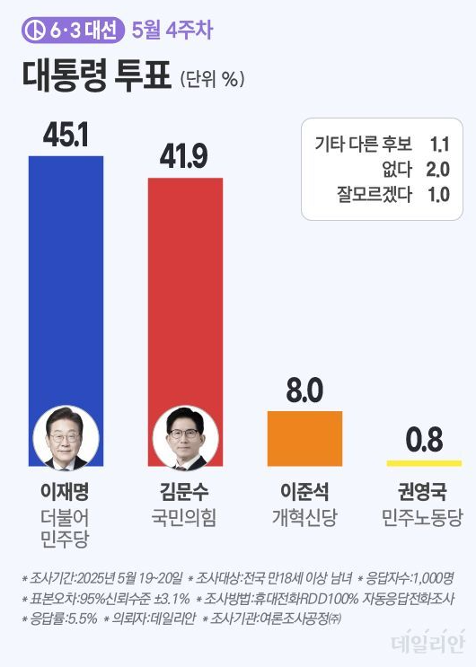 | 여론조사공정 (5.19~20) | 45.1% | 41.9% | 8.0% | 오차범위 내 초접전 |