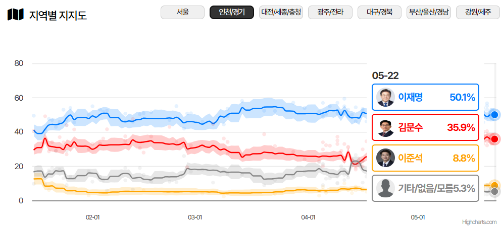 - 경기·인천: 이재명 강세 지속