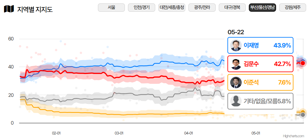 - PK(부산·울산·경남): 박빙 (김문수 44%, 이재명 43%)