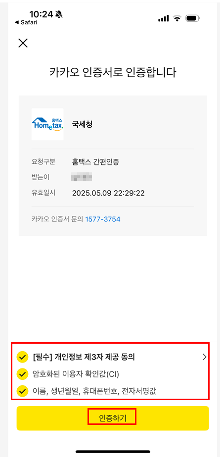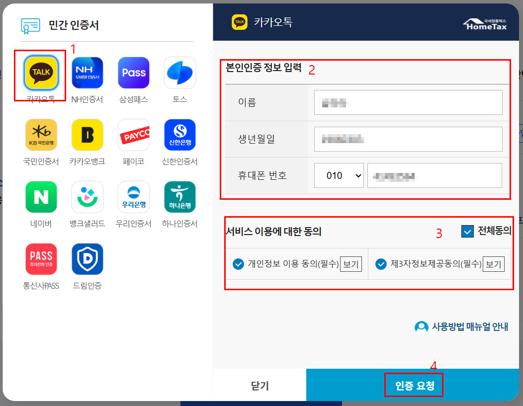 4. 카카오톡 인증서를 클릭한 후 본인인증 정보 입력(이름, 생년월일, 휴대폰 번호) 후 서비스 이용에 대한 동의 전체 동의 체크 후 인증요청을 눌러주세요!