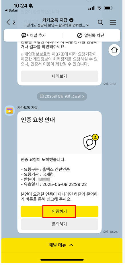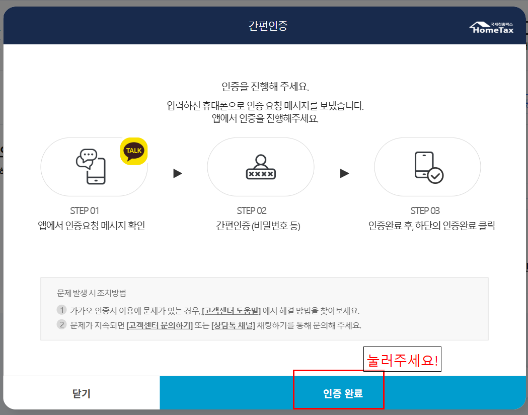 5. 핸드폰 카카오톡으로 인증요청 안내가 오면 위의 방법대로 인증을 한 후 다시 국세청 홈텍스로 돌아와서 인증완료를 누르면 로그인 됩니다! (카카오톡 인증은 꼭 핸드폰을 통해서 하셔야해요.)