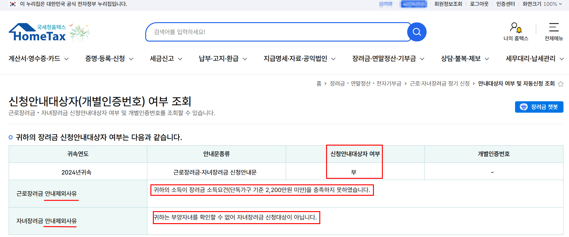 6. 그럼 바로 근로자녀장려금 대상 여부 조회 결과가 나와요! 저는 위와 같은 사유로 제외 대상자임을 아주 쉽게 확인할 수 있었어요.