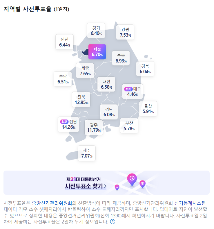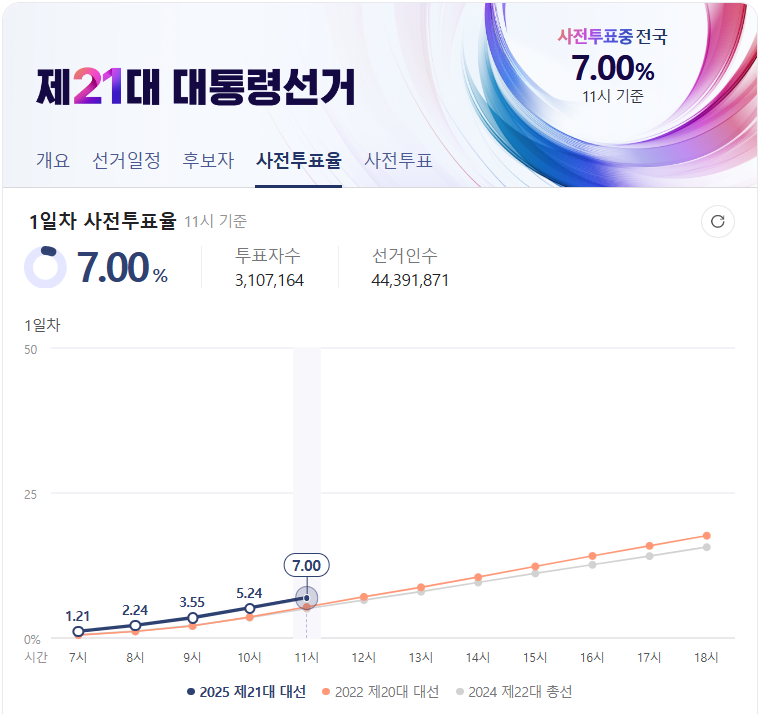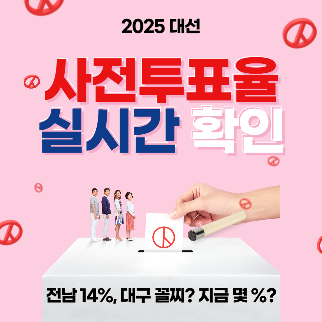 2025 대선 사전투표율 실시간 확인! 전남 14%, 대구 꼴찌…7% 돌파