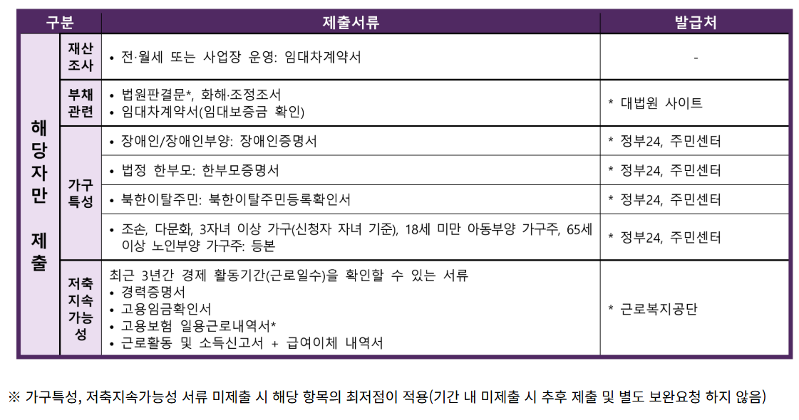 서류는 본인 및 가구의 소득, 재산, 근로여부를 확인하는 것이 핵심입니다.